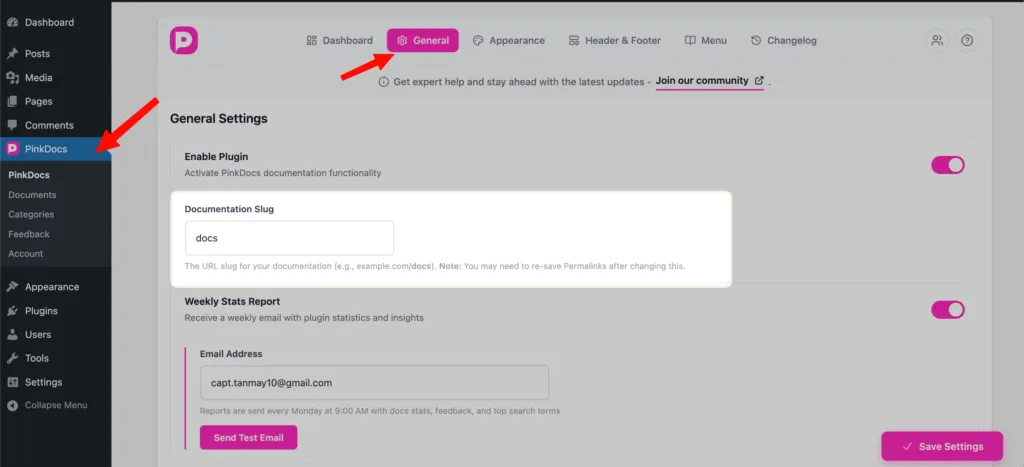 This installation guide provides detailed instructions for developers on how to change the slug of PinkDocs documentation through the plugin settings.