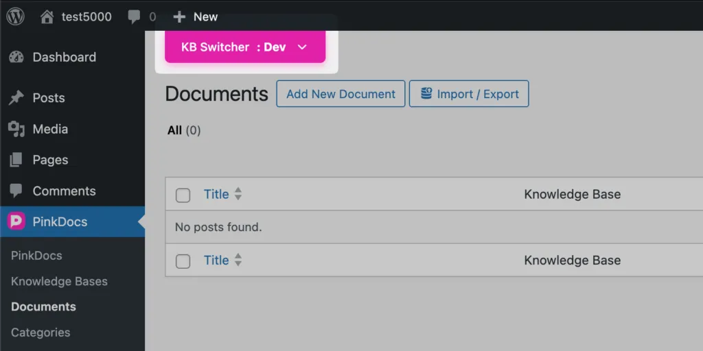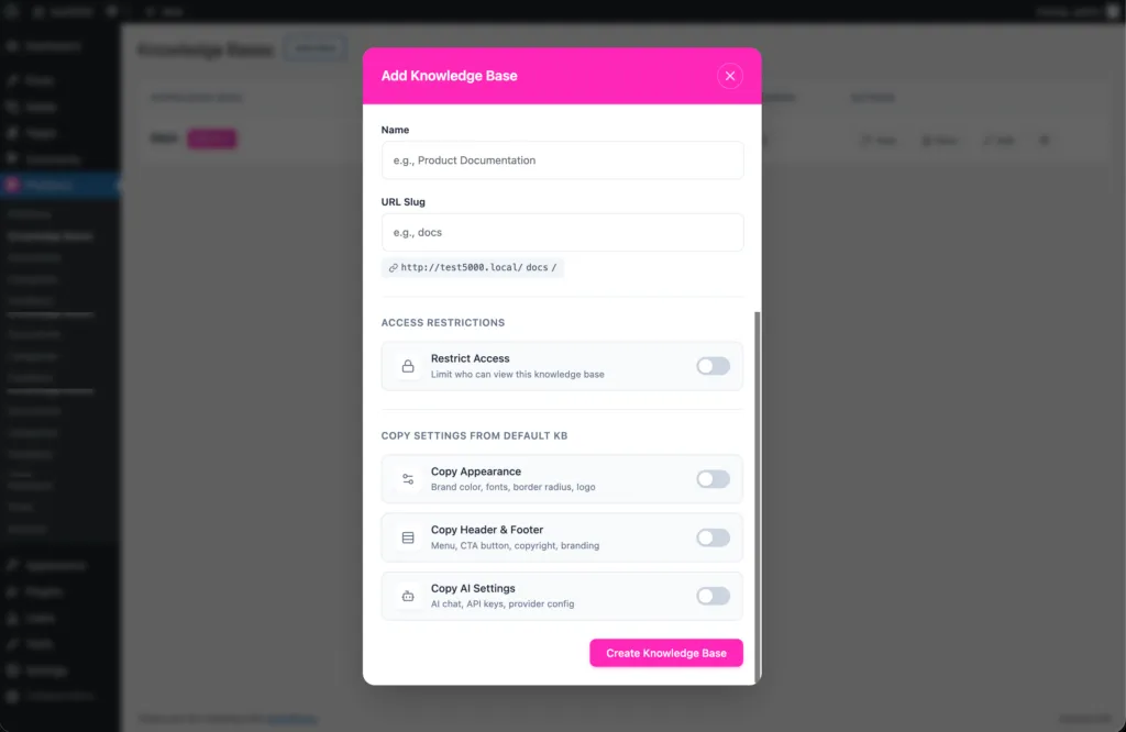 PinkDocs lets you create and manage multiple knowledge bases within a single WordPress site. This is ideal for maintaining separate documentation for products internal teams customers or clients while keeping everything organized and easy to manage. Follow the steps below to create a new knowledge base in detail.