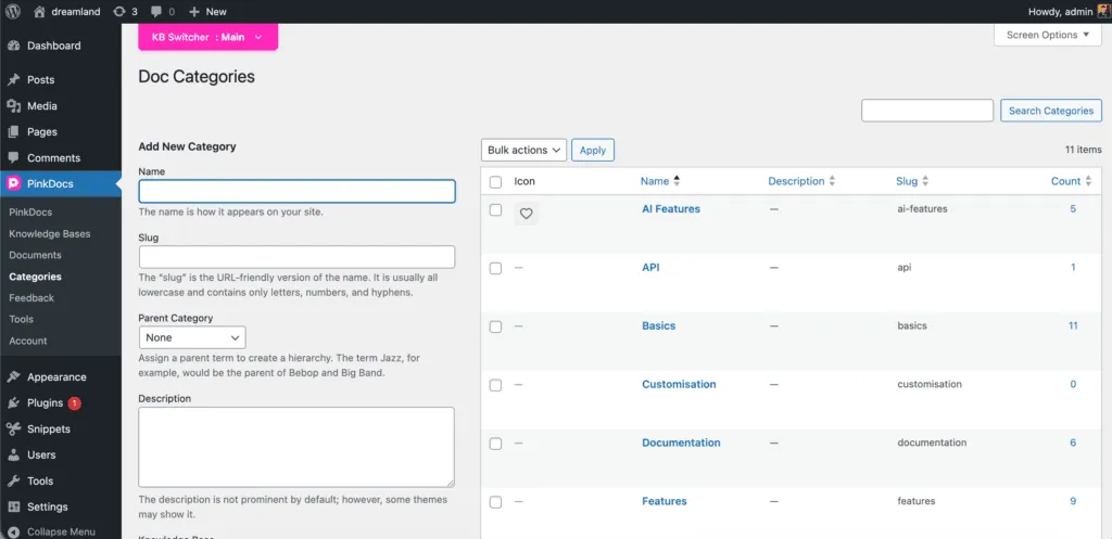 - Go to WordPress Dashboard → PinkDocs → Categories