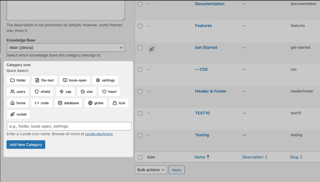 PinkDocs allows you to assign custom icons to documentation categories. These icons help users quickly recognize sections and improve visual navigation.
