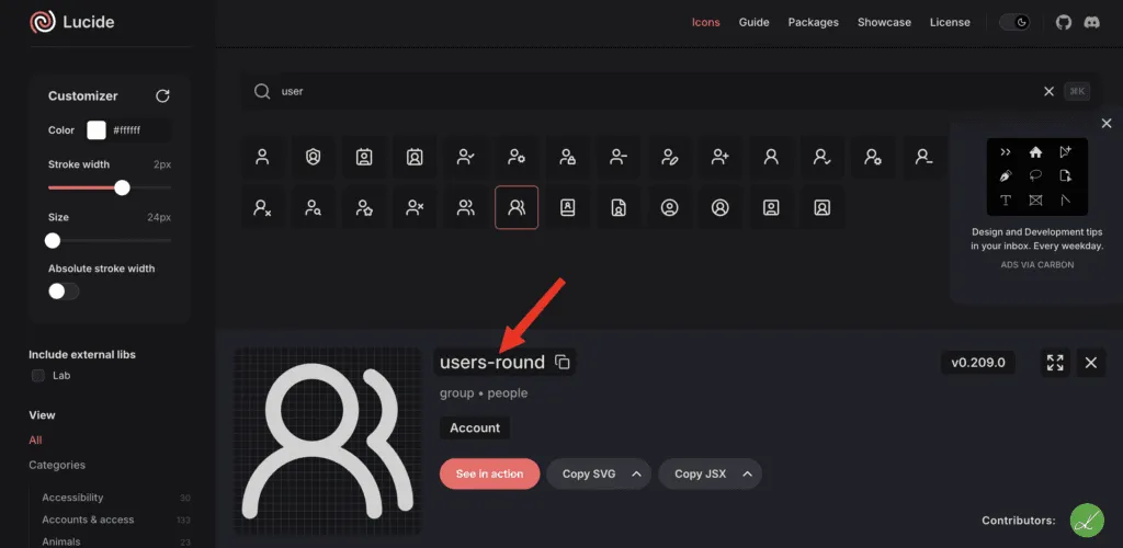 - Type a Lucide icon name (for example: