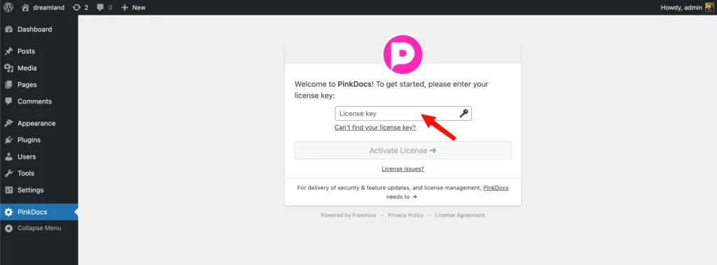 - Check for the PinkDocs menu in your WordPress dashboard.