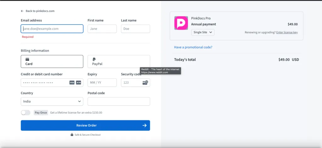 You will be redirected to the Freemius checkout page. Here, you’ll need to enter your payment details.