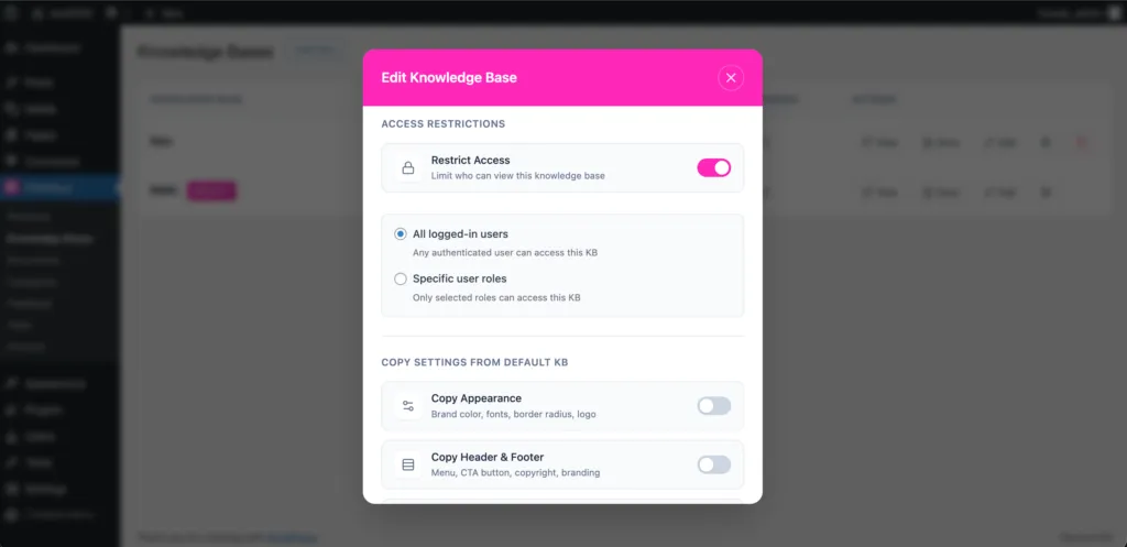 PinkDocs allows you to control exactly who can access each knowledge base, making it easy to create public documentation, customer-only help centers, or fully private internal docs. Using access restrictions, you can limit visibility to logged-in users or specific WordPress user roles, ensuring the right content is seen by the right audience.