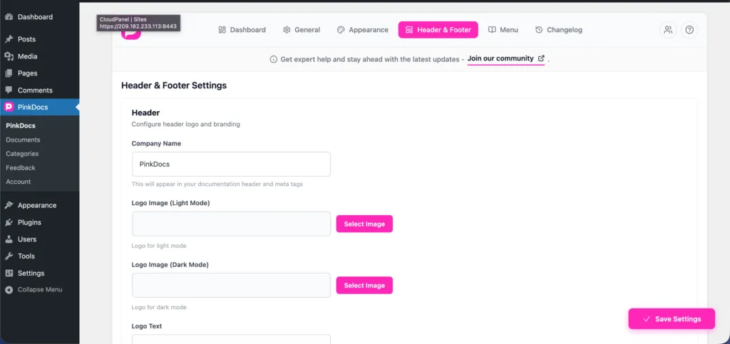 PinkDocs allows you to control how your documentation header looks directly from the Header & Footer section inside Plugin Settings.