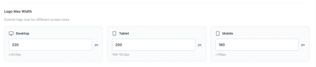- Desktop (≥1024px): Set the maximum logo width for large screens (e.g. 220px).