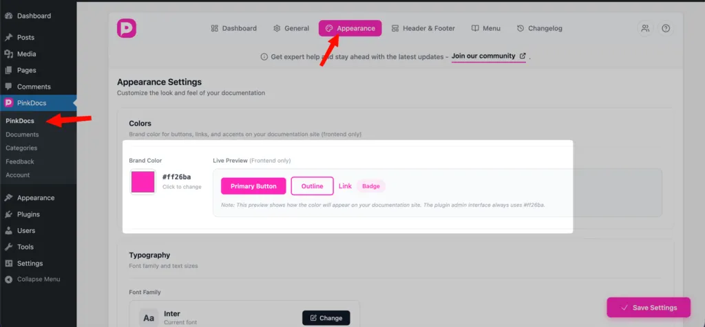 Inside PinkDocs, click on the Appearance tab at the top. This section controls the visual styling of your documentation.