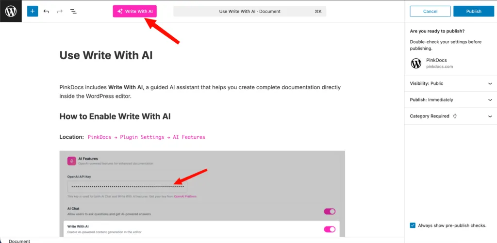PinkDocs includes Write With AI, a guided AI assistant that helps you create complete documentation directly inside the WordPress editor.